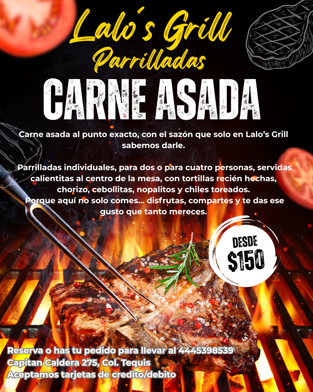 Ya sea en nuestro restaurante o en tu parrilla, el sabor de Lalo’s Grill te va a conquistar.